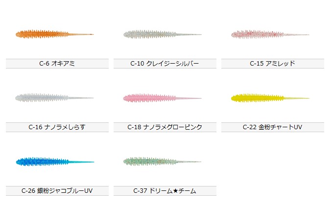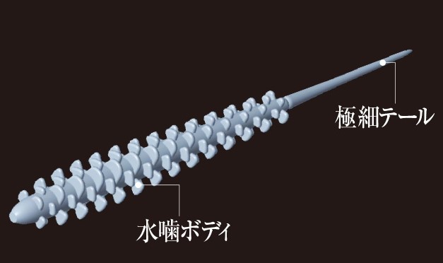 リングでもなくリブでもない、水をつかみやすい松ぼっくりのようなカサ状ボディが、軽いジグヘッドでも操作感をUPさせ、 独自の波動を生み出す。また、超極細のピンテールはわずかな水流でもピリピリっと機敏に動き、魚の本能へとアピール。 空気をまといやすく水平に近い姿勢をキープしやすいため、迷わず魚もパクっとバイト!!気がつけば大漁?なんてことも?!