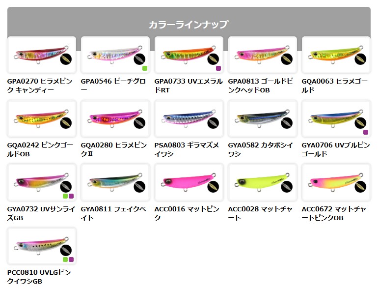 マットピンク, ピーチグロー, UVピンクサンライズGB, UVエメラルドRT, ギラマズメイワシ, UVLGピンクイワシGB, ゴールドピンクヘッドOB