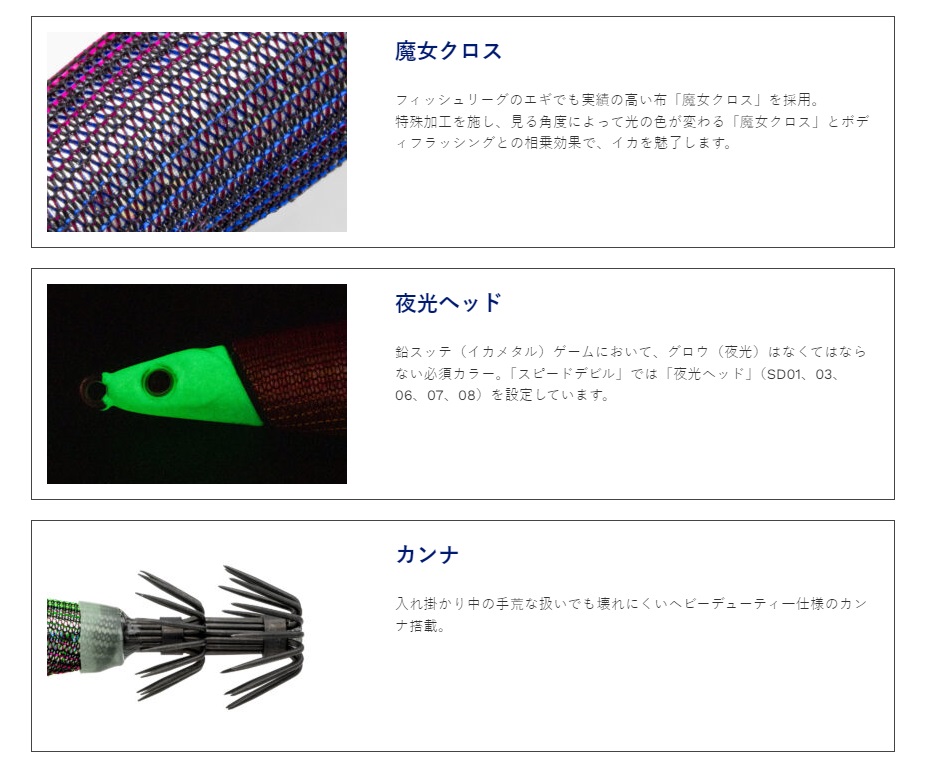 狙うタナまですばやく到達できる沈下速度を追求した「スピードデビル」深場を狙う時、潮が速い時や二枚潮などで底が取りにくい時に最適な鉛スッテです!太軸のカンナは、入れ掛かり中の手荒な扱いでも壊れにくいヘビーデューティ仕様