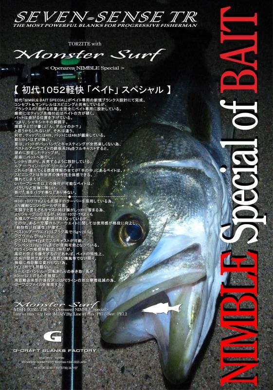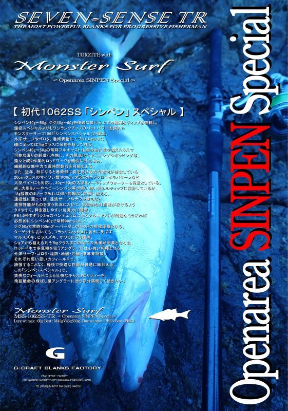 2017年、モンスターサーフ1092爆投スペシャルが誕生する。 先に販売したモンスターサーフ1072シューティングスペシャル同様、2010年から開発テストを開始し、本来であれば「PEシリーズ」で販売する筈であったが、開発段階でブランクスコンセプトの最大の課題であった50gジグがフルキャストできるパワーを保有した上での最大級の軽量化」を目指した為、他のカテゴリーロッドと平行して開発していくうちにどんどんブランクスの新製法が確立され、「もっと軽く、さらに強く」が過剰に発展、そこへ、トルザイトリングのリリース情報が飛び込み、急遽、「TRシリーズ」での販売へと企画変更。 一部のアングラーには広大なサーフで行われる毎年恒例の大会でこっそりと展示した為開発途中のブランクスを数年前から握った方も居たかと思う。 その度に「もう出来る?」「さすがに来年には出るよね?」と苦いご指摘を何度も受け、ようやく販売出来るブランクスが完成した経緯があるこの1092は、「TRシリーズ」の例に漏れず、ティップに30t+40t、バットには30t+40t+46tを複合成型。 MSS1072TRがサーフ標準スペックとするならば、このMSS-1092-TRは、50gのジグをフルキャストは言うに及ばず引き抵抗が重く、水圧抵抗の掛かる30g前後の大型ミノーや35g前後のウッドポッパー・ペンシルや1ozジグヘッドワームが軽快に扱える外洋サーフの大型魚に対応できるブランクスとして設計。 風速10mを超える荒れた外洋サーフで良く使用されている「北西スペシャル」の弟分的立ち位置を意識し、爆風時でも振り切れるプロト自重188gの軽量ロッドは10kgを超えるサーフ最大クラスのブリに完全対応する。 長年に亘り、完成を先延ばしにしてまで造り込んだ軽量ブランク爆風ブッタ切り仕様のこの「爆投スペシャル」で広大でパワフルなサーフゲームを思う存分満喫して頂きたい。