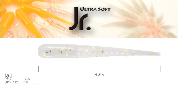 しかしただ単にダウンサイズ化するだけでは意味がありません。 ノコギリ刃の様なギザギザの三角リブもジュニア1.3インチ専用に角度を変えました。 また、ワームがショート化する事でワームのボディに張りが出て動きが変わるのを、片面だったスリット(溝)を両面に入れる事で、柔らかさと動きを調整することに成功しました。