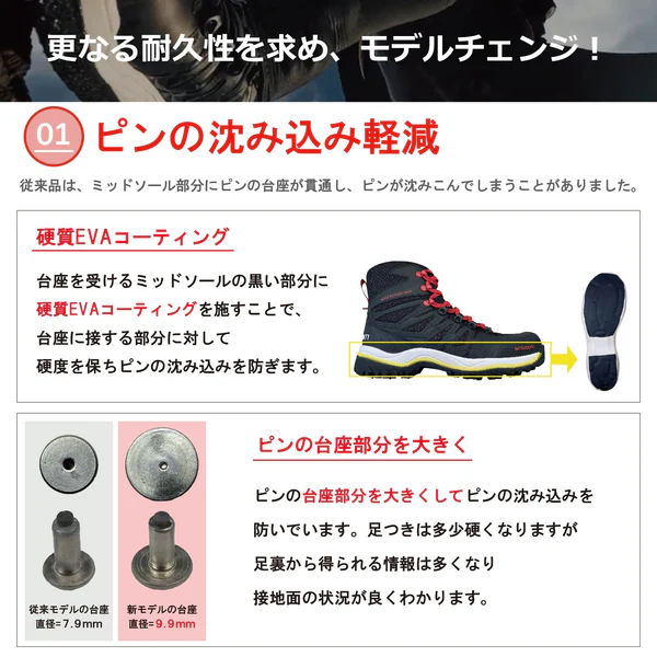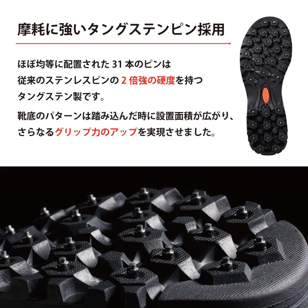 31本のタングステンピン × ソールパターンによるグリップ力に、無縫製により縫い目を少なくした結果、高い耐久性を誇ります。