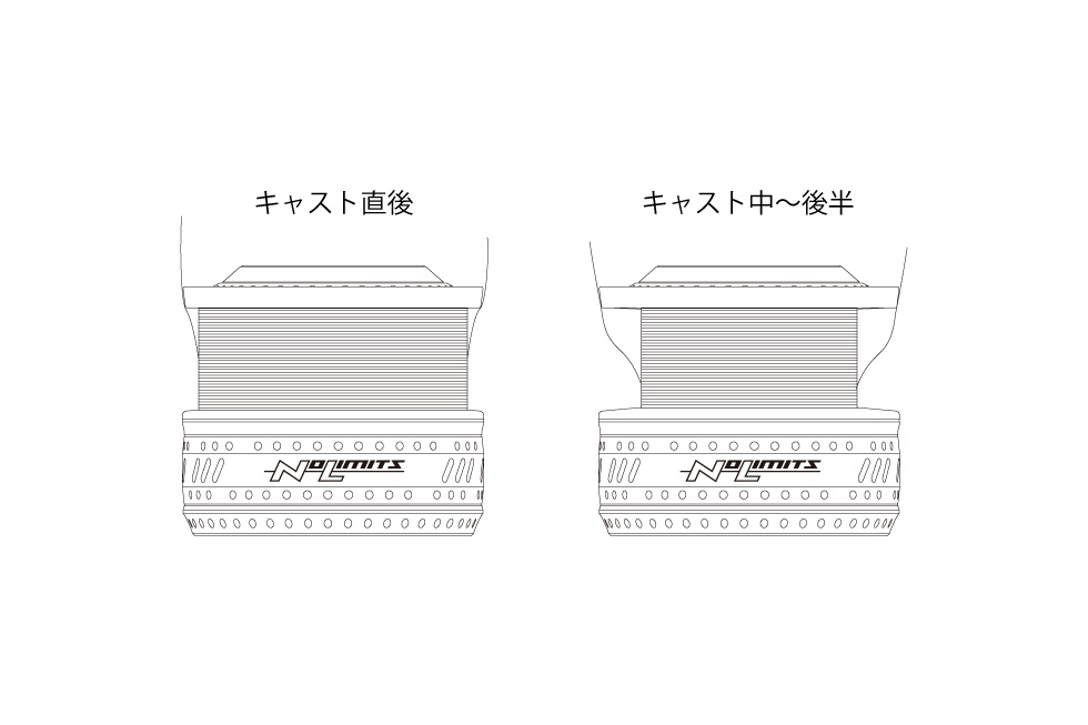 スプールリングに一部カット面を施し、キャスト初期にスプールリング部のカット面と通常面でラインタッチを繰り返し、フェザーリング状態を作り出します。
