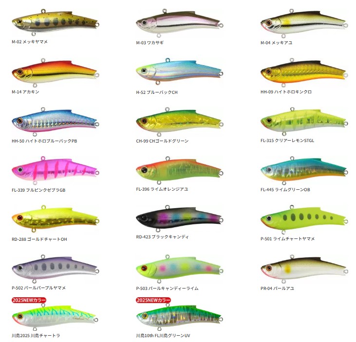 FL川島グリーン, 川島ブルピンSTGL, FL川島グリーンUV, 川島チャートラ, パールアユ, ハイトホロキンクロ, アカキン, ライムオレンジアユ, ブラックキャンディ, ライムグリーンOB, パールパープルヤマメ, パールキャンディライム
