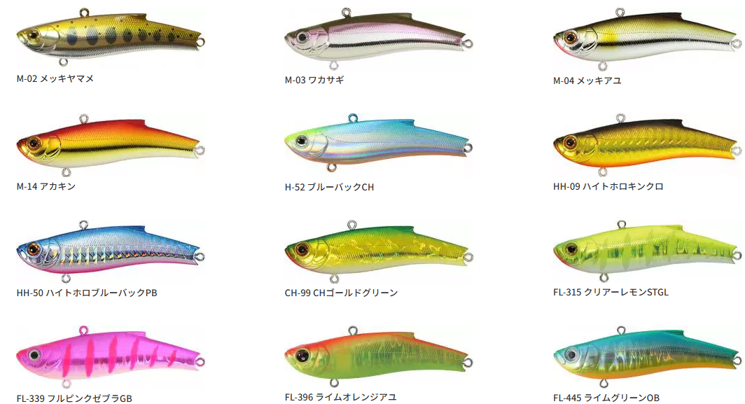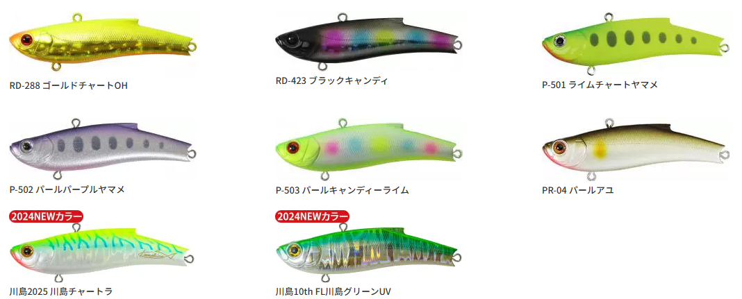 川島ブルピンSTGL, パールキャンディライム, アカキン, FL川島グリーンUV, 川島ブルーブラック, 川島チャートラ, CHゴールドグリーン, フルピンクゼブラGB, パールパープルヤマメ, ライムグリーンOB, ライムオレンジアユ, ブラックキャンディ, ライムチャートヤマメ