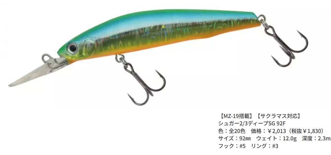 シュガーディープに比べ、リップ面積を約2/3として潜行レンジを浅めに設定し、さらに飛距離を大幅に向上させ、静音性も高めました。ちなみに2/3と書いてツーサーズと読みます。