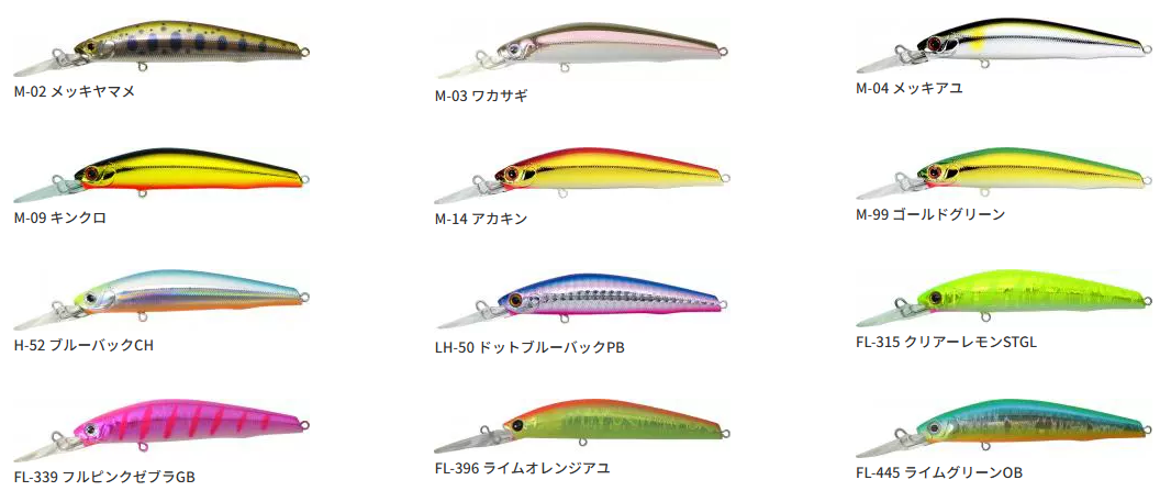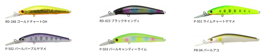 川島2021川島ブルピンSTGL, 川島2025川島チャートラ, パールアユ, キンクロ, クリアーレモンSTGL, ゴールドグリーン, フルピンクゼブラGB, ライムオレンジアユ, アカキン, ブラックキャンディ, ライムグリーンOB, ライムチャートヤマメ, パールパープルヤマメ, パールキャンディーライム