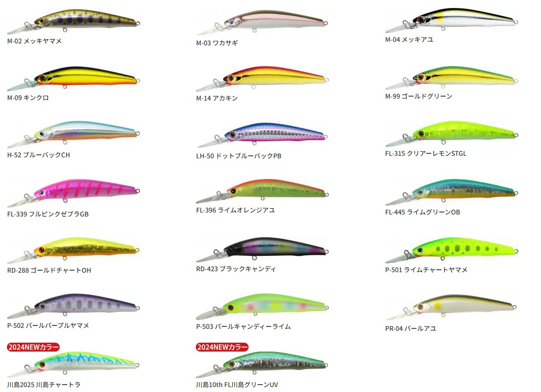 川島2017KAWASHIMAフルピンクゼブラ, 川島2018ブルーバックゴールドSTGL, 川島2021川島ブルピンSTGL, 川島2022FL川島グリーンUV, 川島2025川島チャートラ, パールアユ, オレキン・ピンクベリー, キンクロ, アカキン, ゴールドグリーン, ゴールドチャートOH, ピンクゴールドSTGL, クリアーレモンSTGL, ライムオレンジアユ, ブラックキャンディ, ライムグリーンOB, ライムチャートヤマメ, パールパープルヤマメ, パールキャンディライム