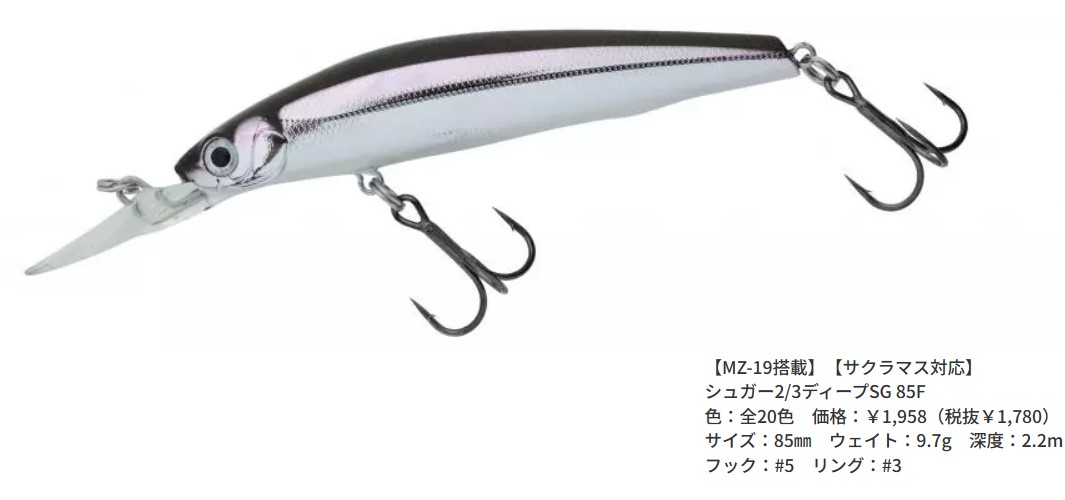 シュガーディープに比べ、リップ面積を約2/3として潜行レンジを浅めに設定し、さらに飛距離を大幅に向上させ、静音性も高めました。ちなみに2/3と書いてツーサーズと読みます。